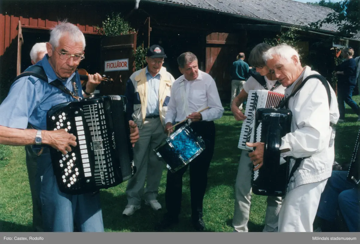Spelmansstämma på hembygdsgården Börjesgården i Hällesåker, Lindome, i Mölndals kommun den 8 juli 2000. Män som spelar på sina instrument.