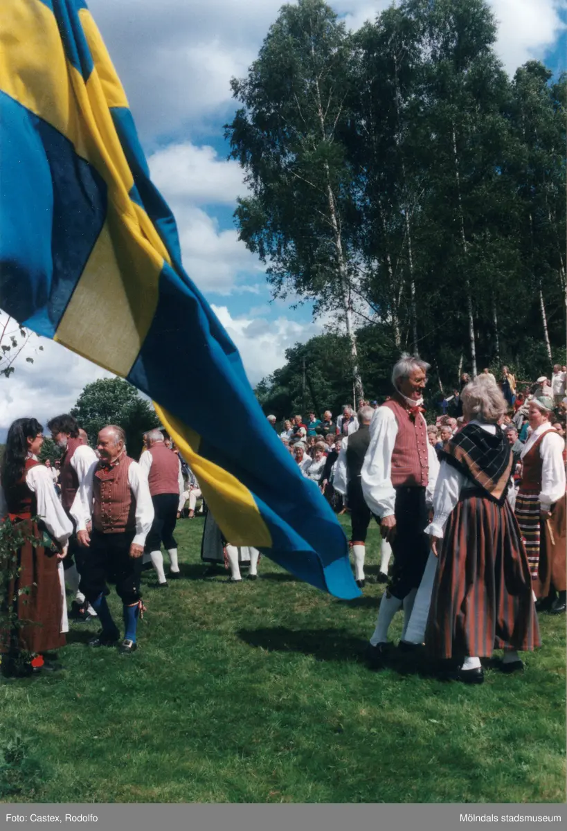 Spelmansstämma på hembygdsgården Börjesgården i Hällesåker, Lindome, i Mölndals kommun den 8 juli 2000. Hällesåkers folkdanslag dansar inför publik.