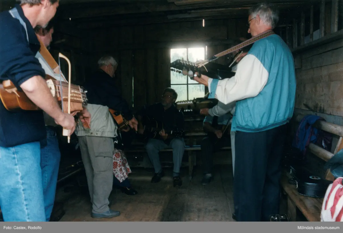 Spelmansstämma på hembygdsgården Börjesgården i Hällesåker, Lindome, i Mölndals kommun den 8 juli 2000. Män som spelar nyckelharpa.