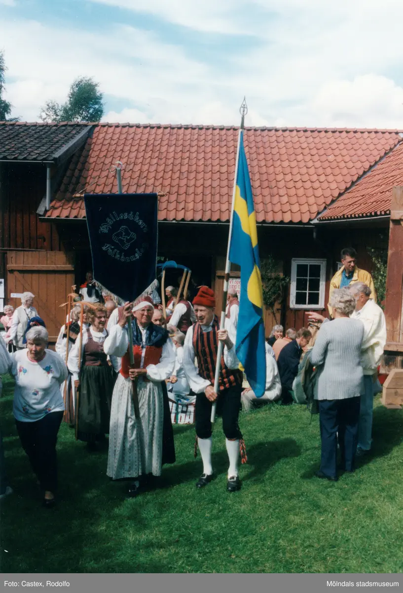 Spelmansstämma på hembygdsgården Börjesgården i Hällesåker, Lindome, i Mölndals kommun den 8 juli 2000. Hällesåkers folkdanslag. Männen bär på liar och kvinnorna bär på räfsor.