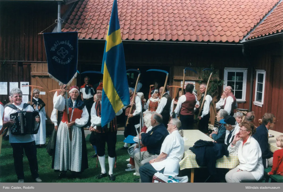 Titel: Spelmansstämma på hembygdsgården Börjesgården i Hällesåker, Lindome, i Mölndals kommun den 8 juli 2000. Hällesåkers folkdanslag. Männen bär på liar och kvinnorna bär på räfsor.