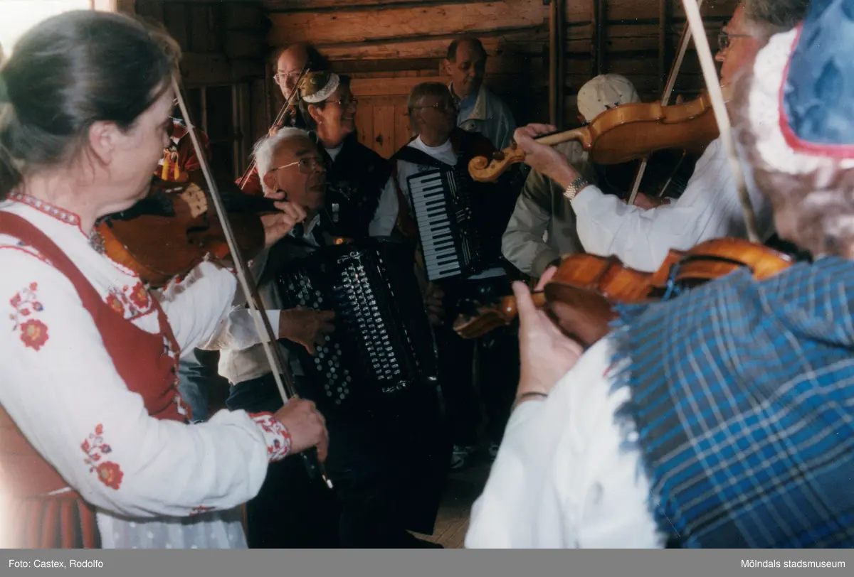 Spelmansstämma på hembygdsgården Börjesgården i Hällesåker, Lindome, i Mölndals kommun den 8 juli 2000. Män och kvinnor som spelar på sina instrument.