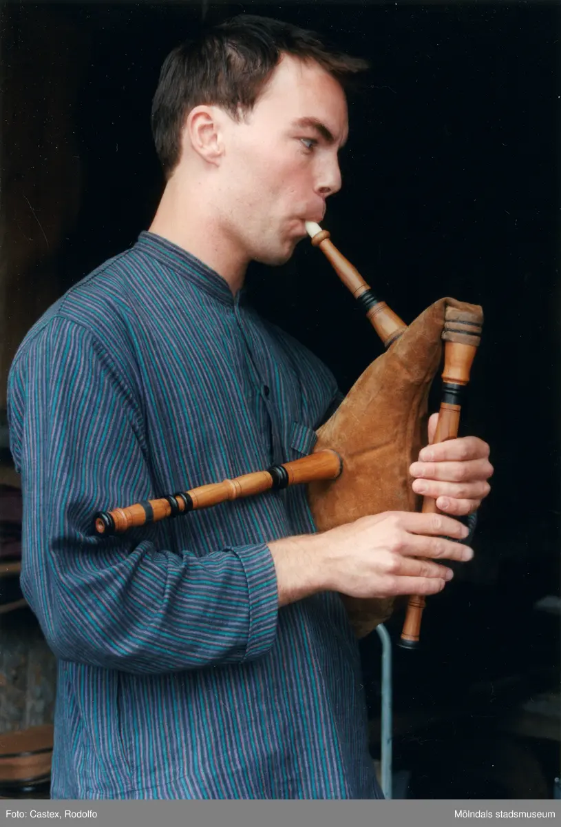 Spelmansstämma på hembygdsgården Börjesgården i Hällesåker, Lindome, i Mölndals kommun den 8 juli 2000. En man som spelar säckpipa.