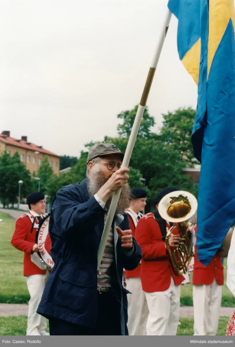Nationaldagsfirande i Stadshusparken i Mölndal den 6 juni 1999. Lars Gahrn bär den svenska flaggan. I bakgrunden Mölndals Paradorkester.