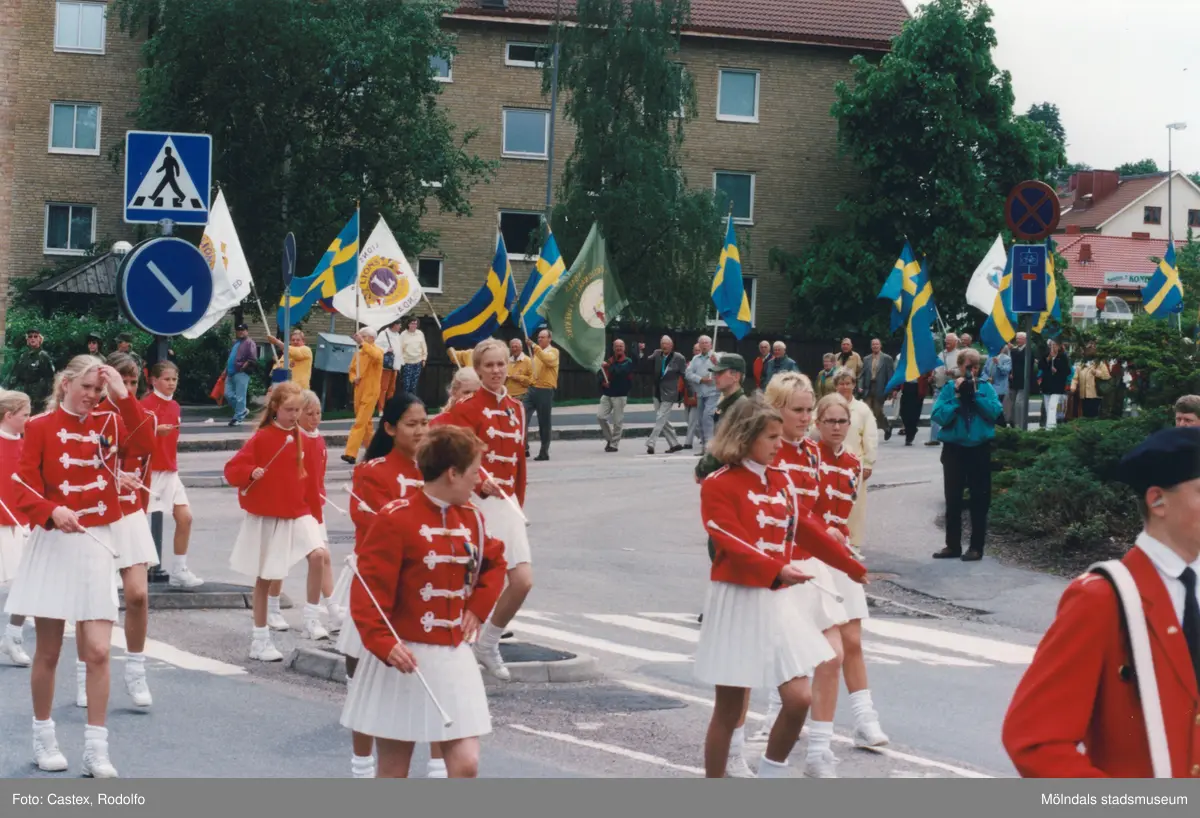 Nationaldagsfirande i Stadshusparken i Mölndal den 6 juni 1999. Här ses en samling människor tåga in på Häradsgatan. I förgrunden Mölndals Paradorkester, i bakgrunden svenska flaggor och föreningsflaggor.