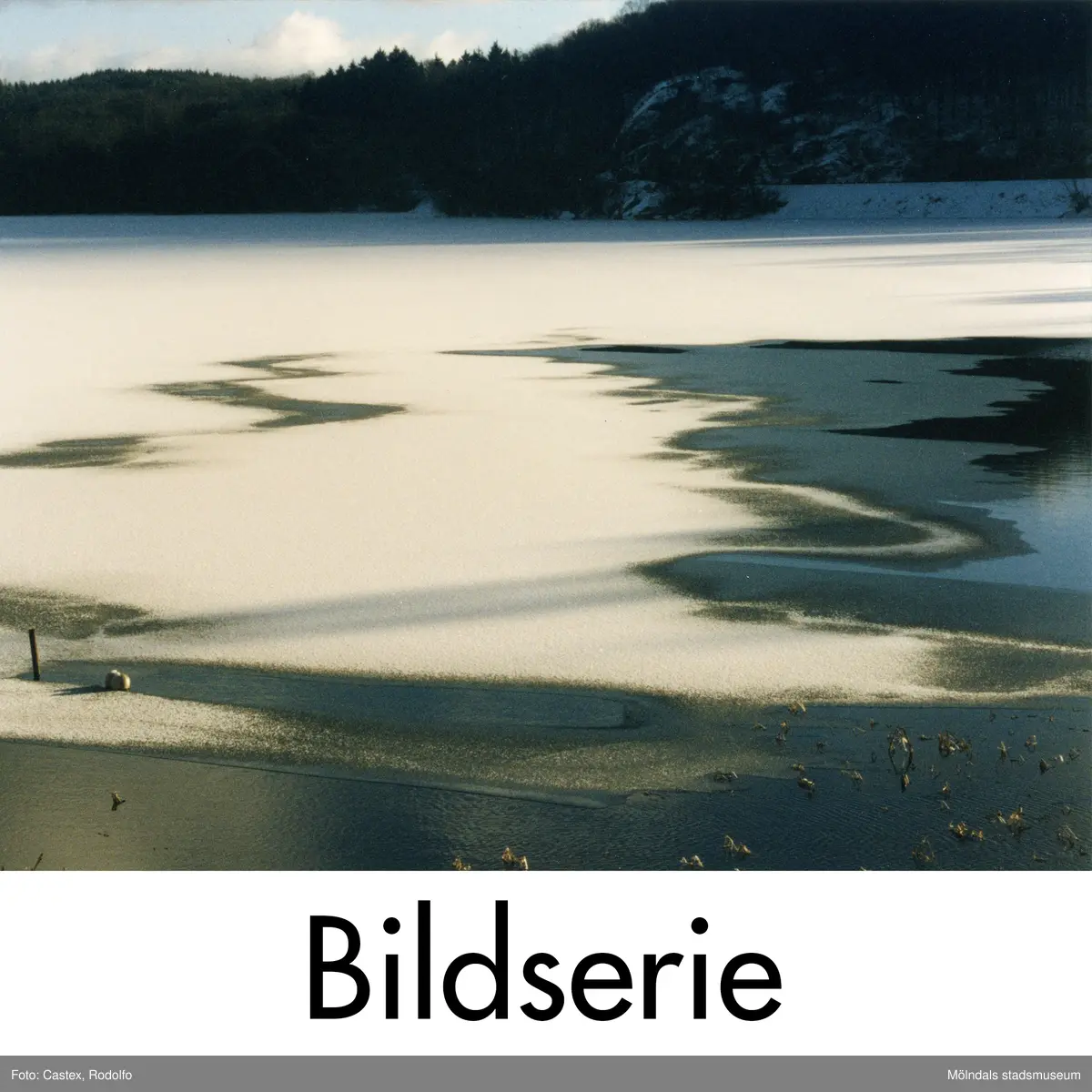 Serie om 12 fotografier som visar Stensjön i Mölndal, januari 2000.