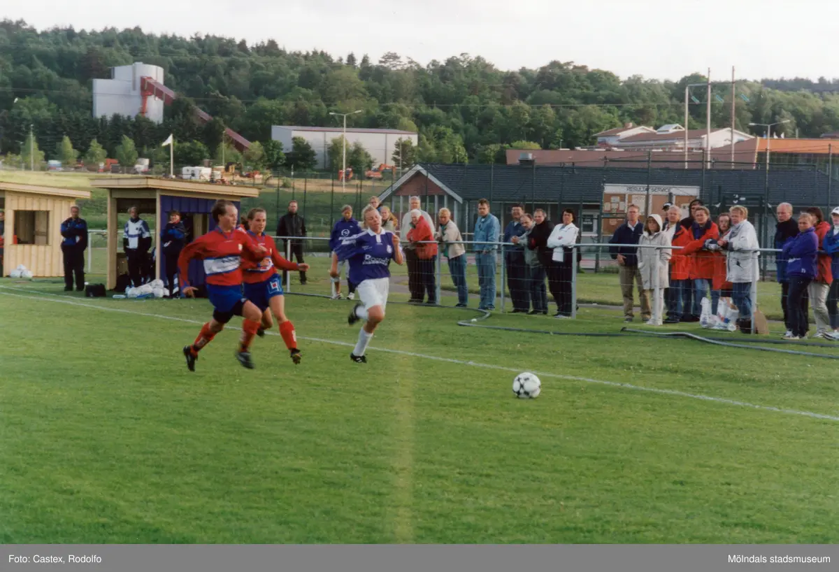 Fotbollslaget Jitex BK spelar match på Åbyvallen i Mölndal, maj 2000. Motståndarlag och slutresultat är okända. I bakgrunden Riskullaverket.