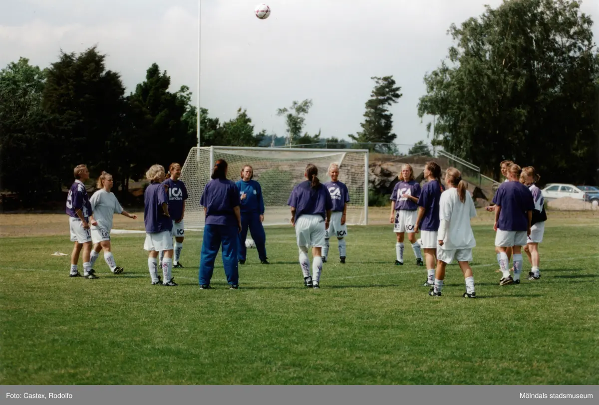 Fotbollslaget Jitex BK spelar match på Kvarnbyvallen i Mölndal, år 1998. Motståndarlag och matchresultat är okända. Uppvärmning inför matchen.