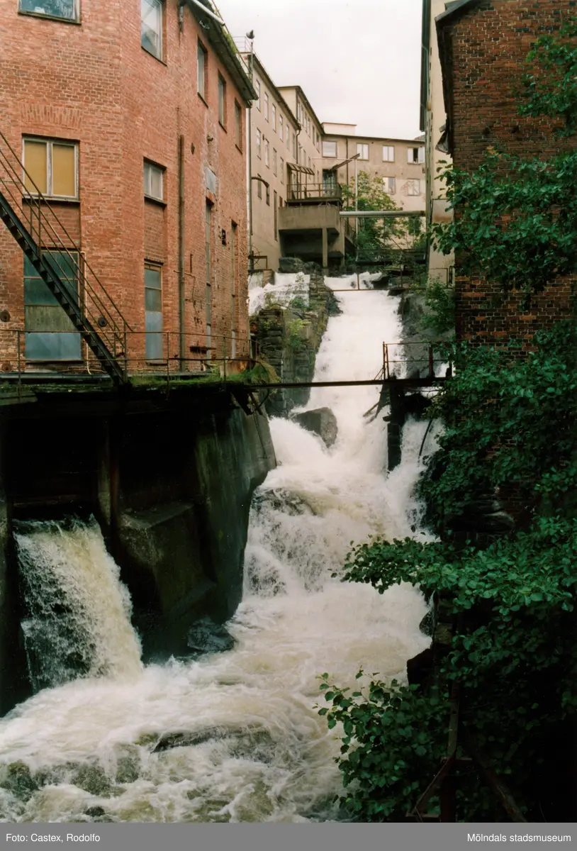 Mölndalsfallen med intilliggande industribyggnader i Mölndals Kvarnby, år 1994.