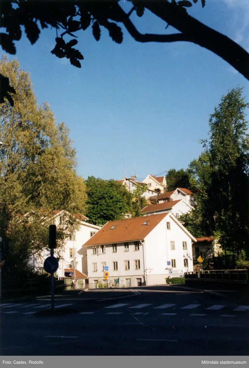 Vy från Kvarnbygatan över Forsebron mot bebyggelse i Mölndals Kvarnby, okänt årtal.