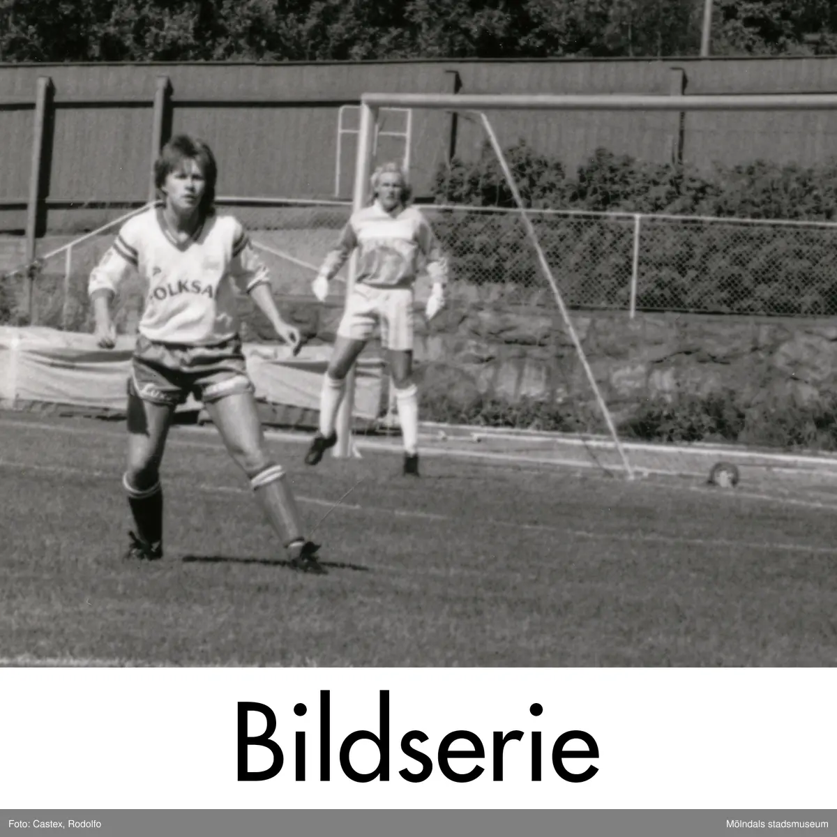 Serie om två svartvita fotografier som visar fotbollslaget Jitex BK spela match på Kvarnbyvallen i Mölndal, cirka år 1991. Motståndarlag och matchresultat är okända. Även bild på den gamla läktaren.