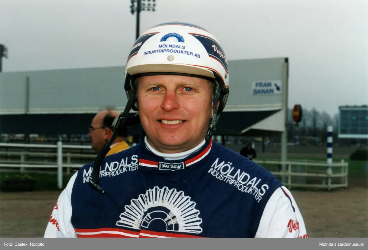 Åbytravet i Åby, Mölndal, under travloppet Olympiatravet, den 10 april 1999. Porträtt av travkusken Veijo Heiskanen.