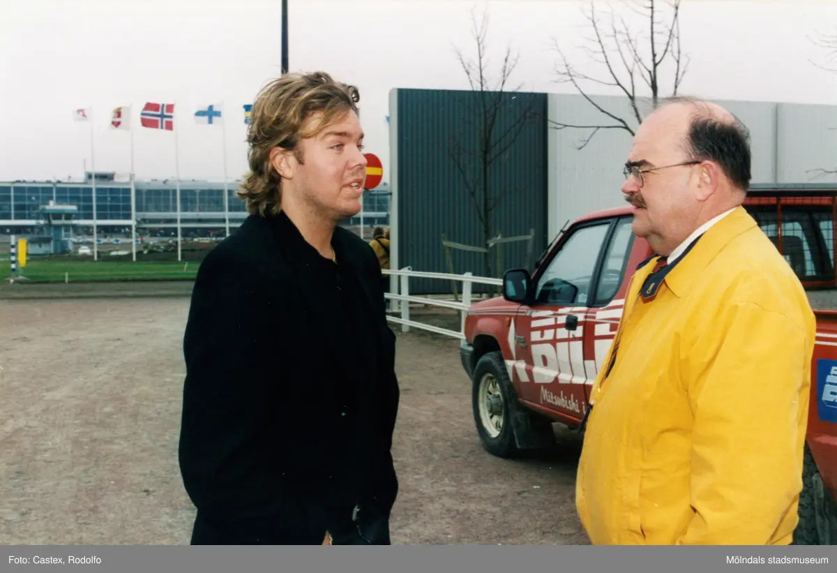 Åbytravet i Åby, Mölndal, under travloppet Olympiatravet, den 10 april 1999. Sportjournalisten Leif "Loket" Olsson samtalar med den före detta fotbollsspelaren Tomas Brolin.