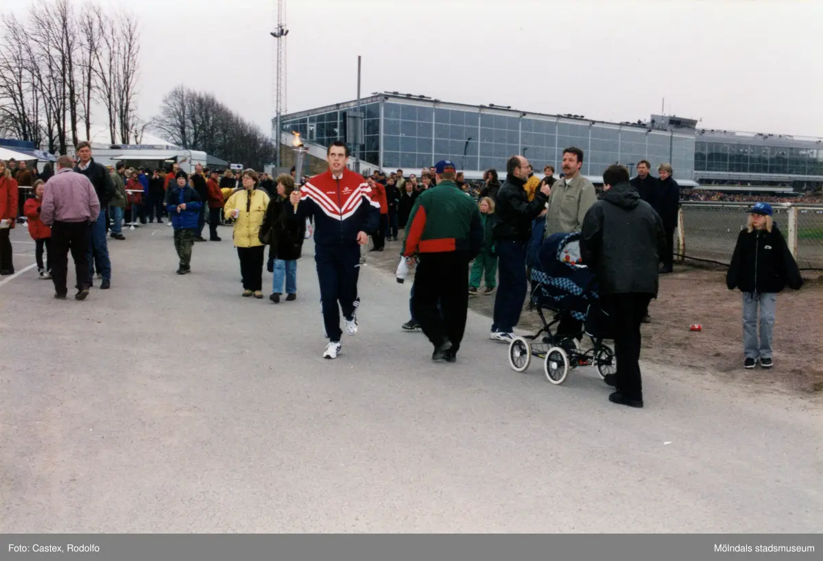 En idrottare springer vid travbanan med den olympiska elden i samband med Olympiatravet på Åbytravet i Åby, Mölndal, år 1998.