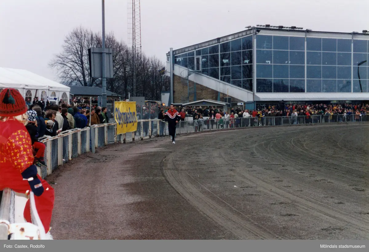 En idrottare springer på travbanan med den olympiska elden i samband med Olympiatravet på Åbytravet i Åby, Mölndal, år 1998.