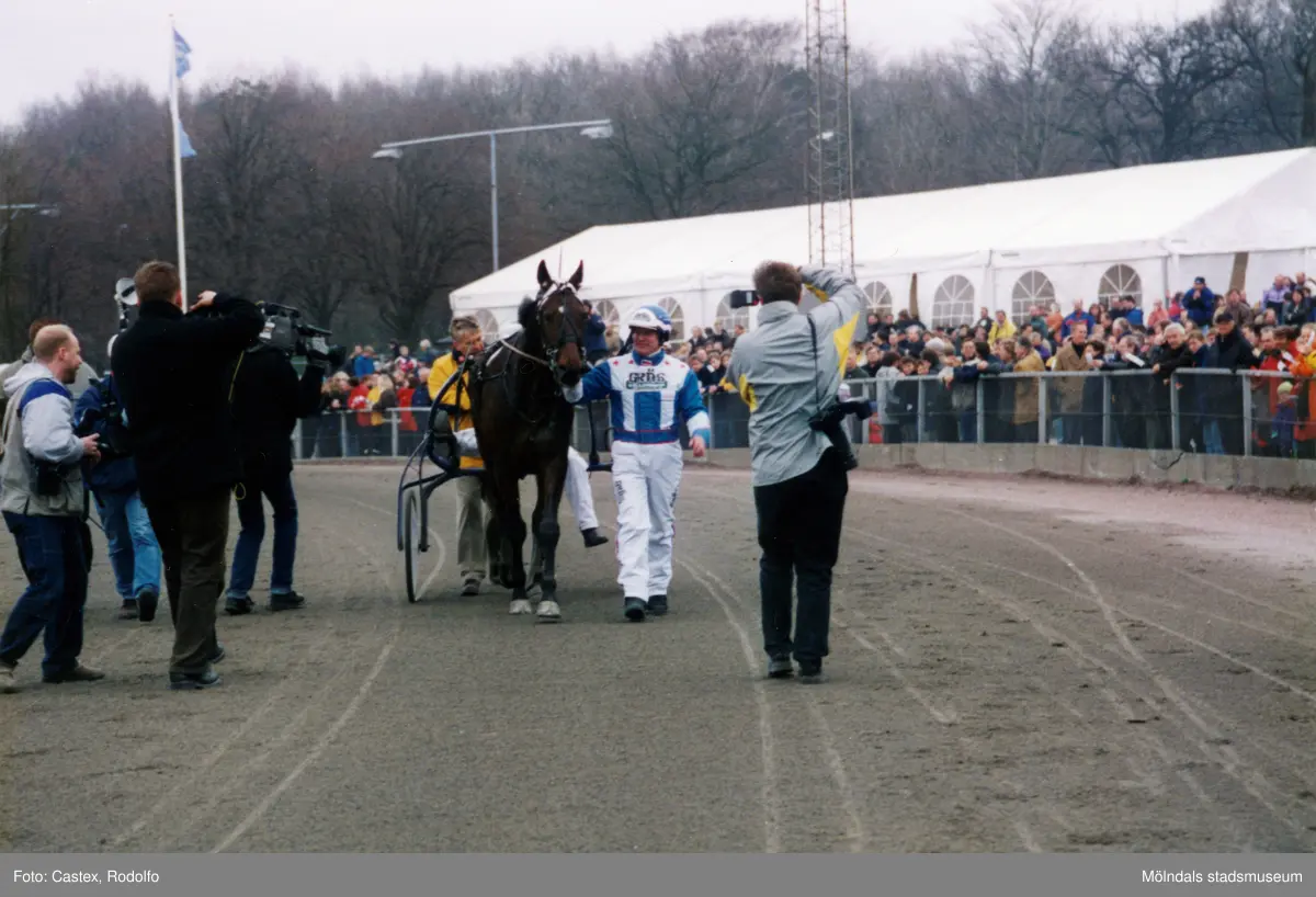 Ett travekipage på banan vid Åbytravet i Åby, Mölndal, år 1998.