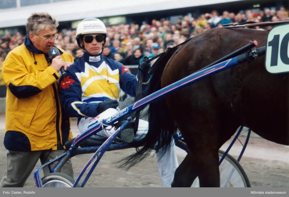 En man intervjuar en travkusk på banan vid Åbytravet i Åby, Mölndal, år 1998.
