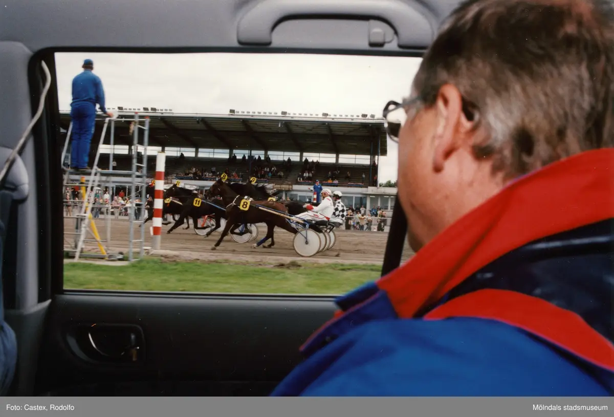 En man följer ett travlopp från en domarbil på Åbytravet i Åby, Mölndal, år 1998.