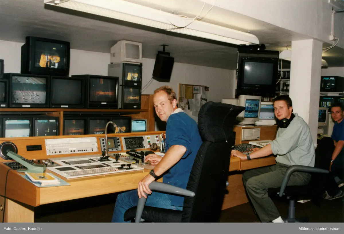 Tre män sitter i ett kontrollrum på Åbytravet i Åby, Mölndal, år 1998.