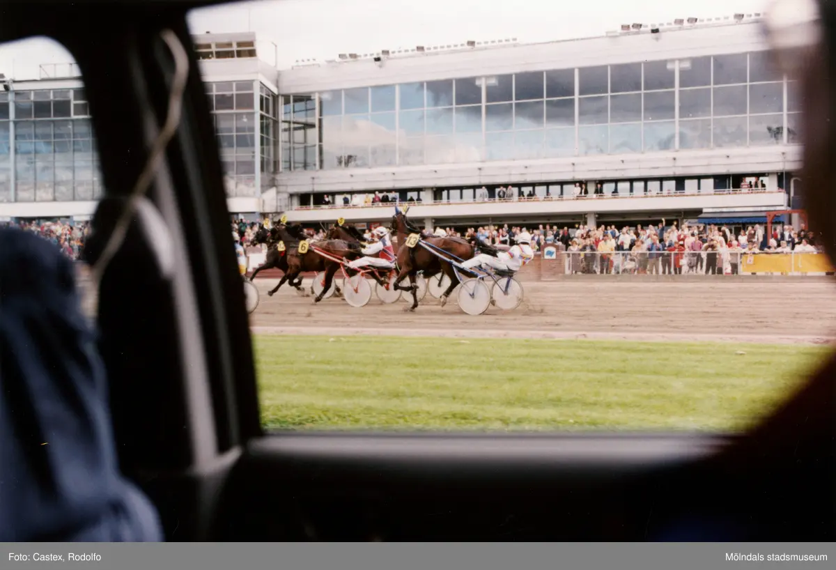 Travlopp på Åbytravet i Åby, Mölndal, år 1998. Vy genom rutan på en bil.