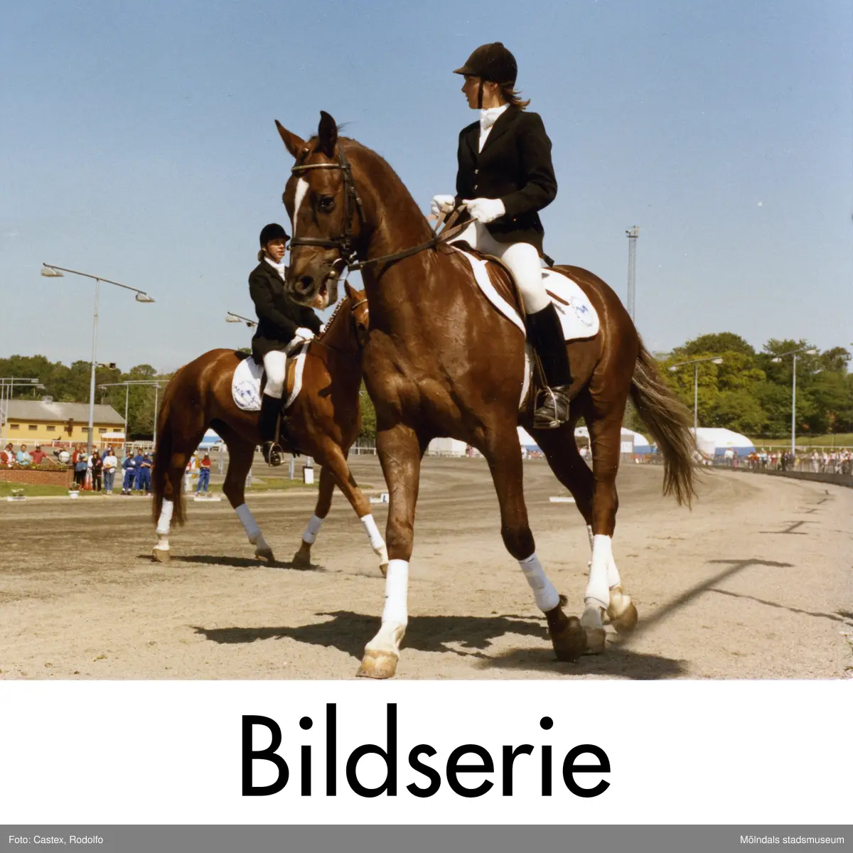 Serie om fyra fotografier som visar dressyrtävling på Åbytravet i Mölndal. Fotografier tagna på 1980-talet?