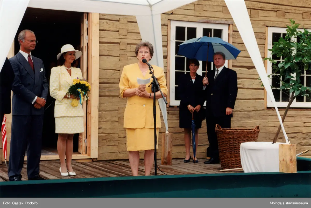 Det svenska kungaparet på besök vid Gunnebo slott i Mölndal den 28 augusti 1997. Här utanför Tjenstefolksbostaden - kafé och konferenslokal.