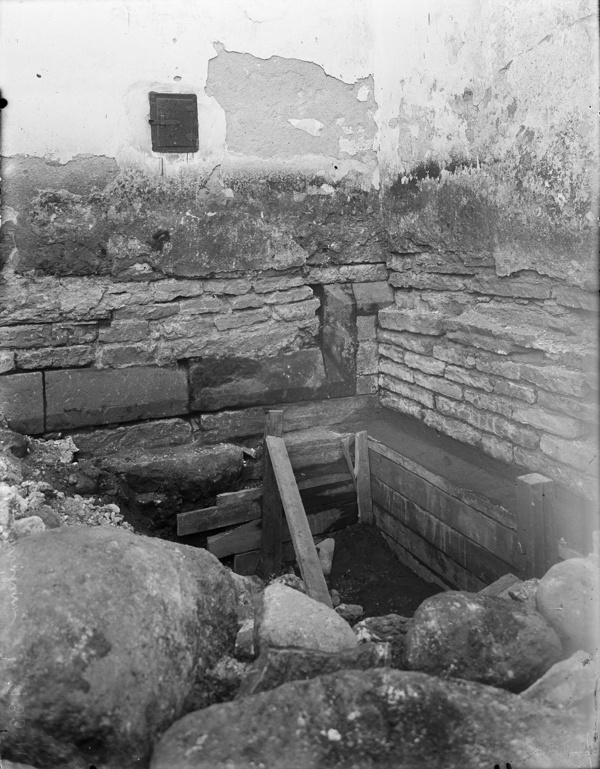 Skarv mellan norra fasaden och dess västligaste strävpelare, från nordöst, efter grundförstärkning.