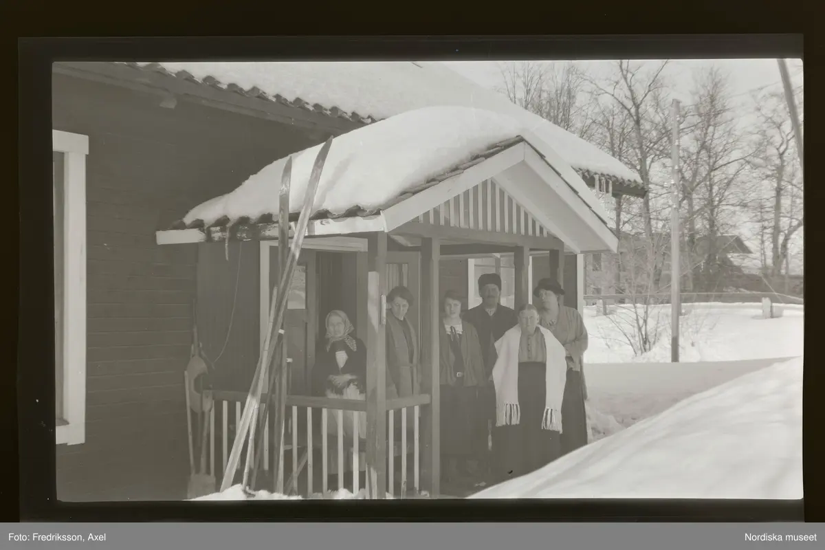 En familj porträtterad på farstubron till ett hus. Ett tjockt snötäcke ligger över mark och hus, ett par skidor står lutade mot sidan av farstubron.