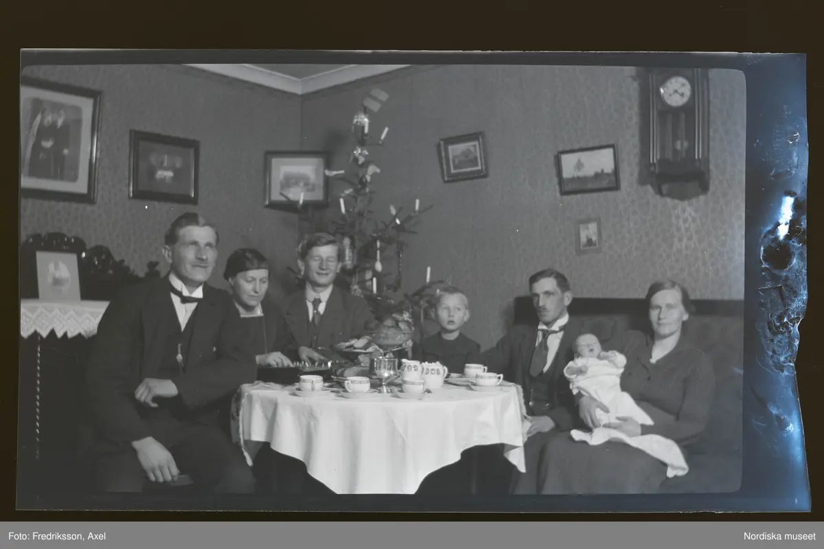 Sällskap samlat runt ett bord dukat med kaffekoppar. I rummet står en julgran.