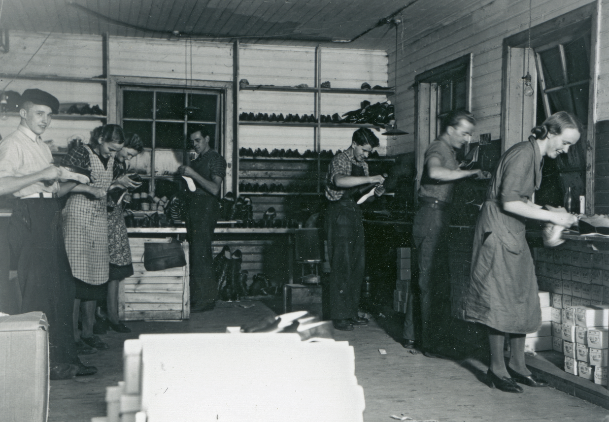 Skoarbetare hos SA Svenssons, klistrar bl.a. fönstret står öppet för lukten. Finns läster till innetofflor.
