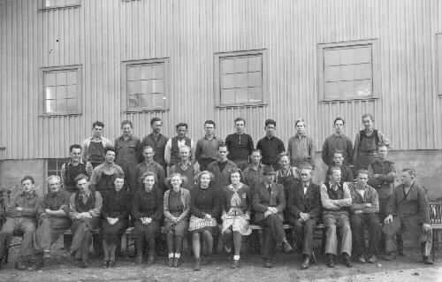 Foto 1. Gruppbild - skoarbetare och nåtlerskor vid SA Svenssons skofabrik. Med skofabriken bakom. Fabriken hade eget elverk -råoljemotor- krånglade ofta, men var bra att ha under kriget. Mannen i hatt S A Svensson själv. (Hjalmar Svensson var hans morbror) Första raden längst till höger, Mårtensson.