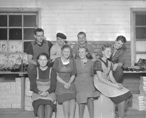 Foto. Gruppbild - skoarbetare och nåtlerskor vid SA Svenssons skofabrik. Skofabriken hade eget elverk -råoljemotor- krånglade ofta, men var bra att ha under kriget. H Bengtsson längst till vänster och O Ljunggren längst till höger.