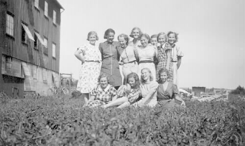 Foto 1. Gruppbild - nåtlerskor vid SA Svenssons skofabrik. Skofabriken syns t.v. fabriken hade eget elverk -råoljemotor- krånglade ofta, men var bra att ha under kriget. Foto 2. Gruppbild - 12 nåtlerskor Foto 3. Gruppbild - 9 nåtlerskor på middagsrast. Foto 4. Gruppbild - arbetsklädda nåtlerskor plus en man. Alla står framför en bil.
