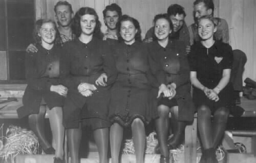 Foto. Gruppbild - skoarbetare och nåtlerskor vid SA Svenssons skofabrik. Skofabriken hade eget elverk -råoljemotor- krånglade ofta, men var bra att ha under kriget. Bakre raden fr.v. Arthur Johansson, Olle Ljunggren, Rolf Andersson o Arvid Bengtsson. Främre raden fr.v. Karin, Sonja Karlsson "Hytt", Karin Eller Kerstin, Vivan o Ingrid Andersson.