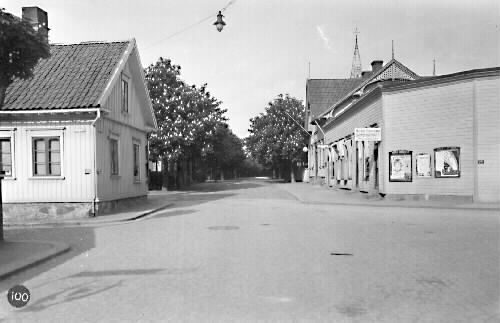 På affärsskyltarna står det Hilma Hansson Barnbeklädnad. Till höger skymtar Järnvägshotellet.