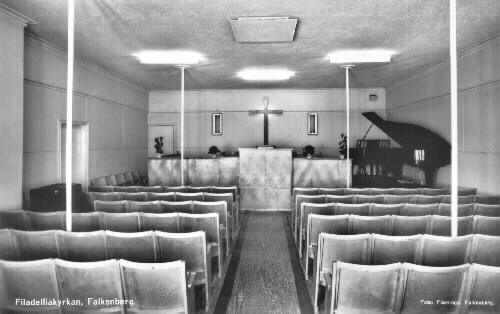 Filadelfiakyrkan i Falkenberg. Invigning 5 nov. 1939, sista gudtjänsten 10 nov. 1963. C.E. Anteckning på baksidan, senast 1956.T.G.
