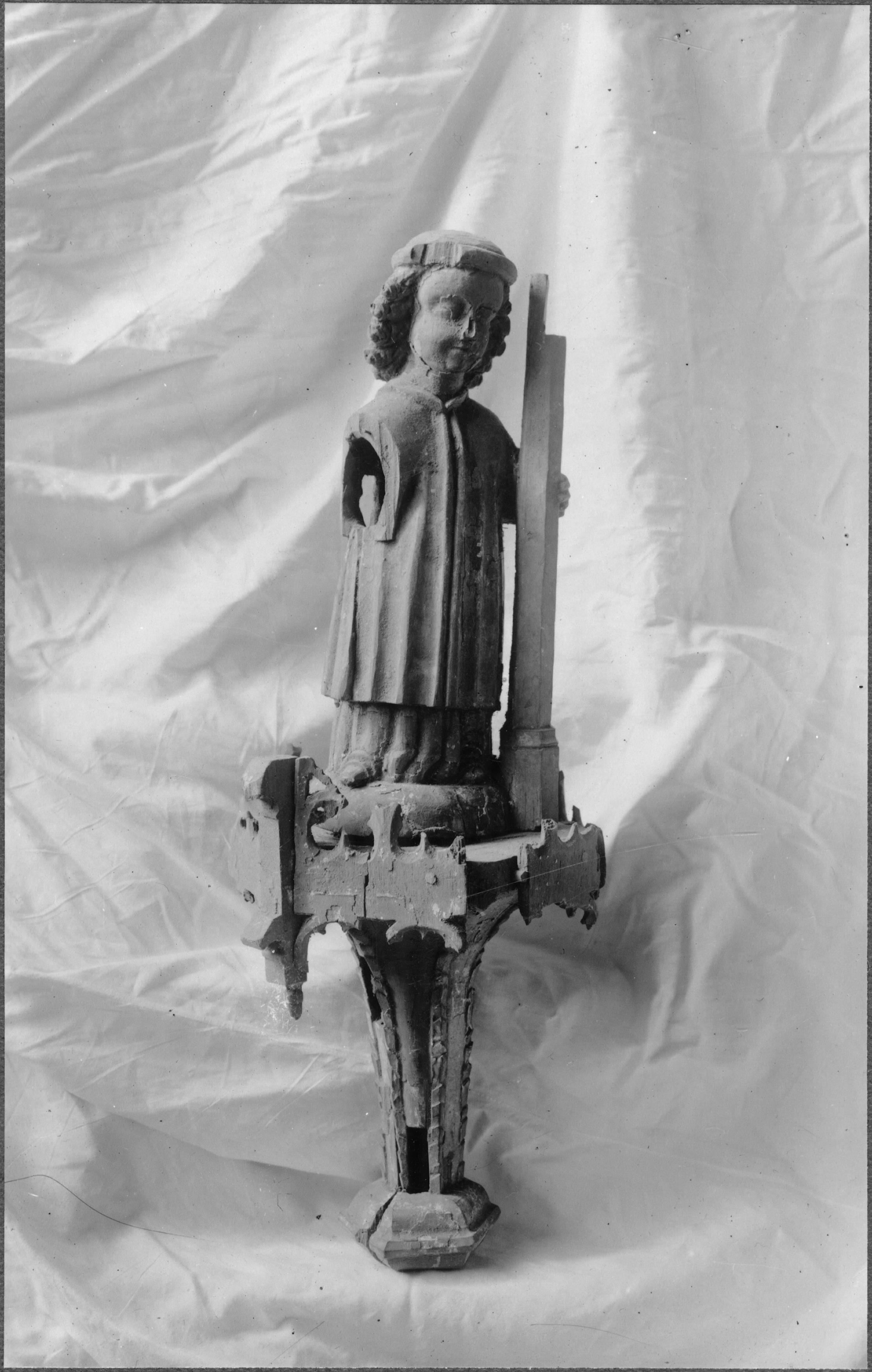 Ljusstavskrön med skulpterad ängel av trä, hållande en kollonn. Ängeln trasig och saknar vingar. Målad i rött, grönt och förgyllt. Ängelns h. 37 cm. 1400-talets slut.