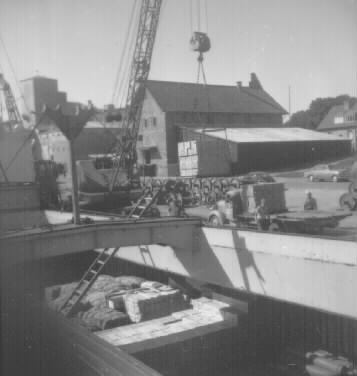 Bilderna kommer från ett arkiv på AB Falcon. På bilderna lastas en båt med kartonger märkta "FALKEN FALKENBERG SWEDEN".