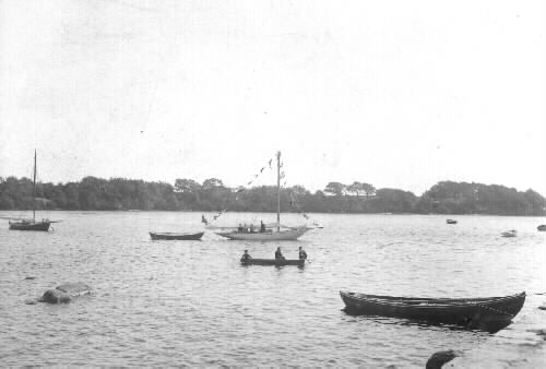 Text på baksidan. G. Boman Sven Bomans segelbåt i "Hålan", byggd av snickare Blåberg.Bakom grönskan skymtar gymnastiksalen till Realskolan. Från 1910-talet. (A.S.)