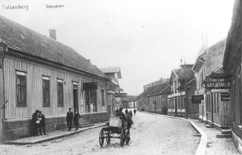 På affärsskyltarna kan man läsa Harry Hallbergs, M Lindegrens boktryckeri, Pappershandel, C Pettersson&Co guldsmed,