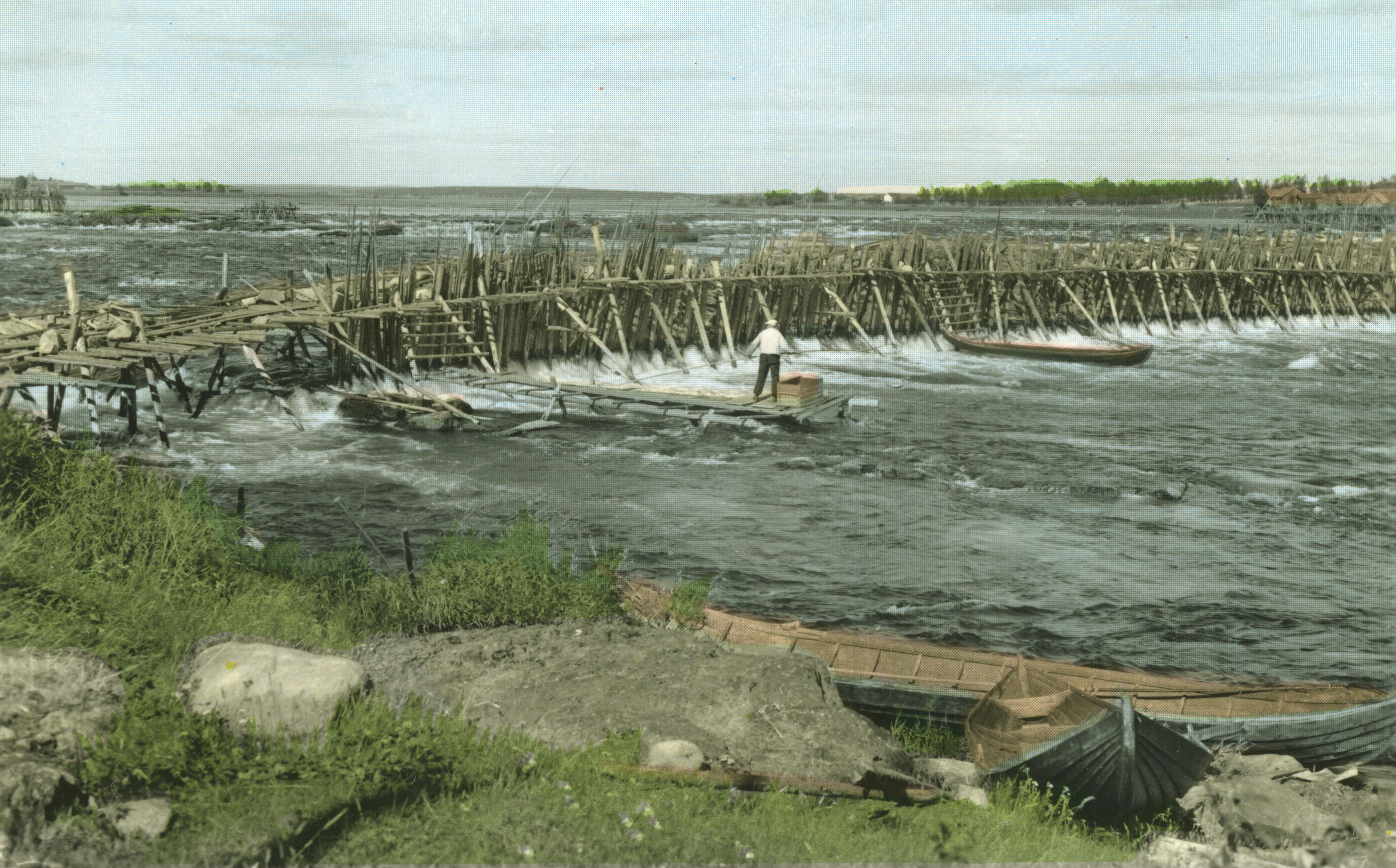 Sikfiske i Kukkolaforsen i Torne älv. Handkolorerad variant av ac00996.