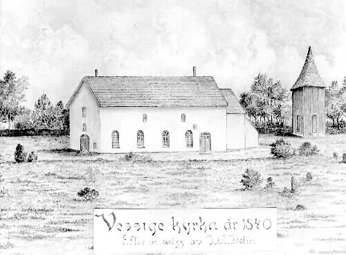 Text enl. inv. kort nr. 2752: Kyrkans längd 32 alnar och bredd 16 alnar. Teckningen en förstoring utförd av Filip Pärson, Falkenberg, efter en skiss på en häradskarta av A.Delin.