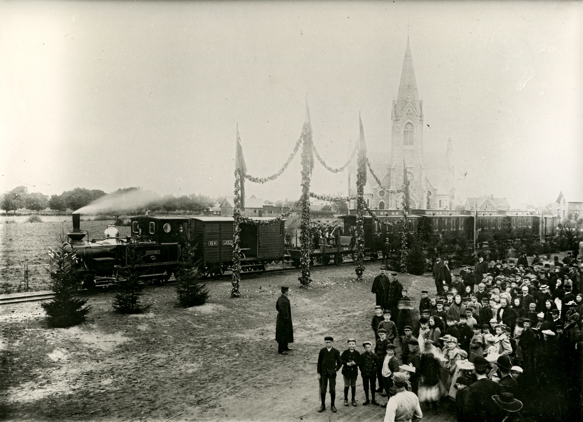 Invigningståget med lok nr. 1 Nordenfalk står klart att lämna Falkenberg den 27 sept. 1894.