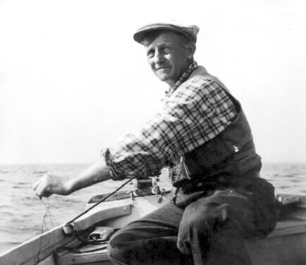 En man i keps, rutig skjorta, väst och byxor sitter i en eka till sjös och dörjar.