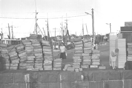 Varbergshamn. En mängd uppstaplade fisklådor på stensatt kaj.