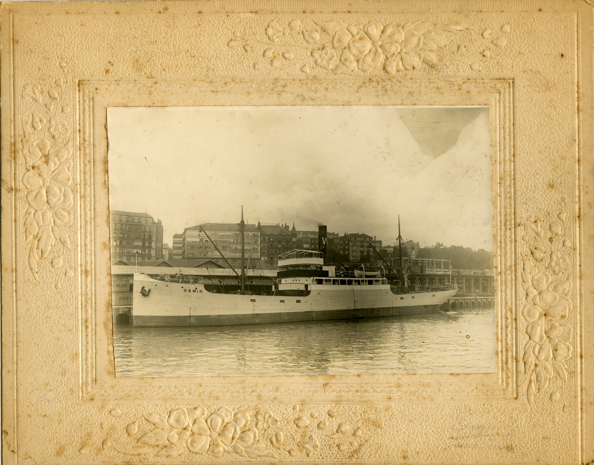 Fotografi av skeppet Oswin, monterat på papper med mönster i relief. 1900-tal. Från Gunnar Henrikssons samling.