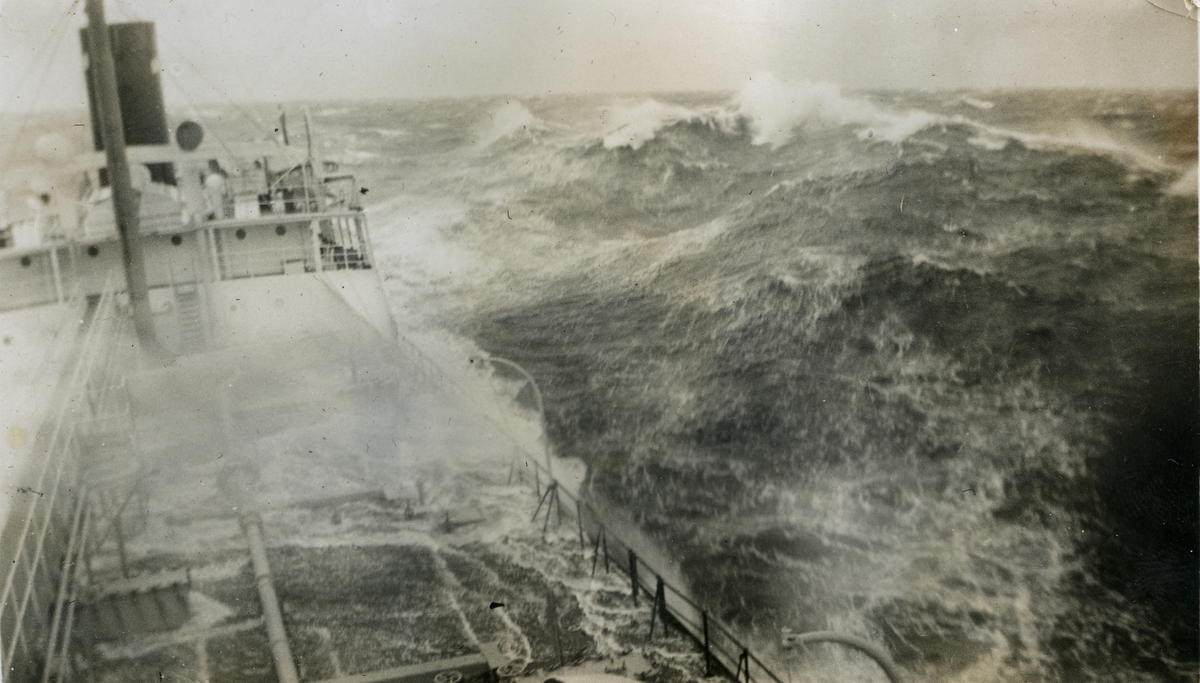 Fotografi föreställande ett fartyg på havet omgivet av höga vågor. 1900-tal. Från Sjöman Gunnar Henrikssons samling.