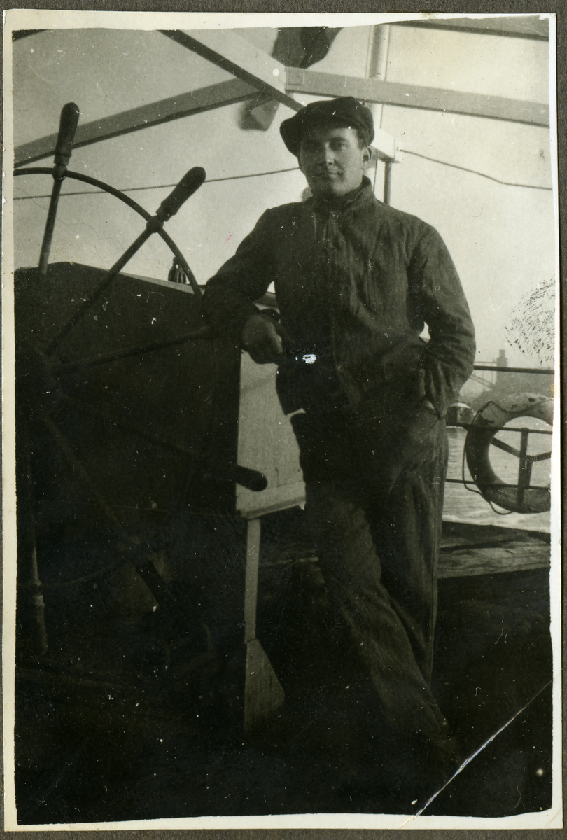 Fotografi föreställande en man ombord ett skepp. 1900-tal. Från Sjöman Gunnar Henrikssons samling.