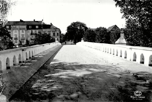 Museets kommentar: Tullbron, restaurering 1927. På fotot synes att det finns en avspärrning vid norra påfarten till bron, samt att det ligger ett sandlager övergatstenen.