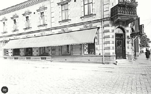 Uppfört av Falkenbergs Sparbank 1895-1896. Indragen butiksentré jämte trappa 1957.(försl. t. bev. pl.) På bilden finns J E Eliassons AB Manufaktur inrymt i affärslokalen.